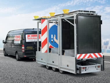 Das Nissen Drop & Pick System ist auch in der Variante Trailer mit Anhänger erhältlich. Die kostengünstigere Ausführung ermöglicht wie der Van die komplette und automatisierte Absicherung ganzer Arbeitsstellen mit nur einem Fahrzeug und einer Arbeitskraft ohne Eintreten in den Verkehrsraum.
